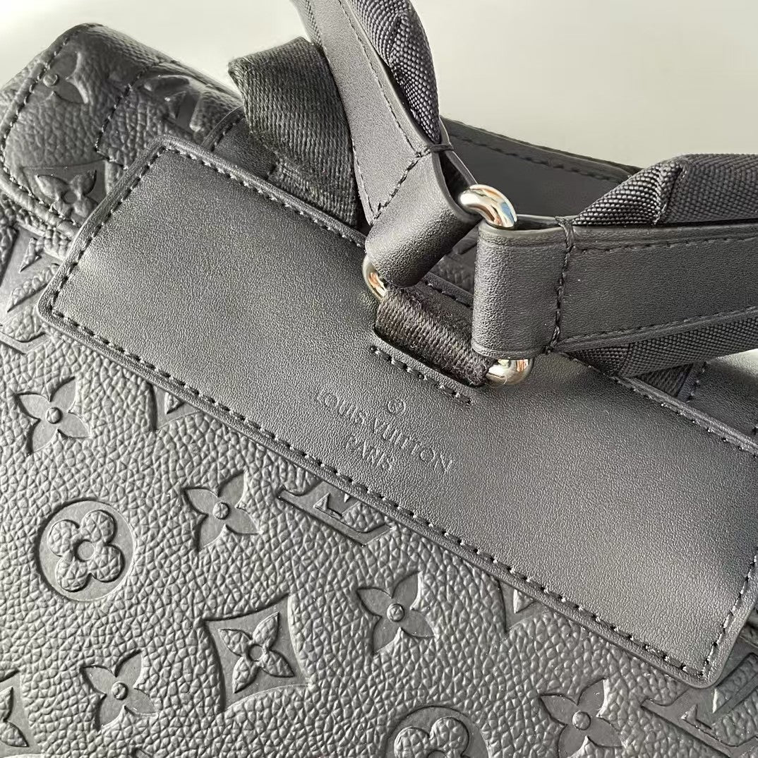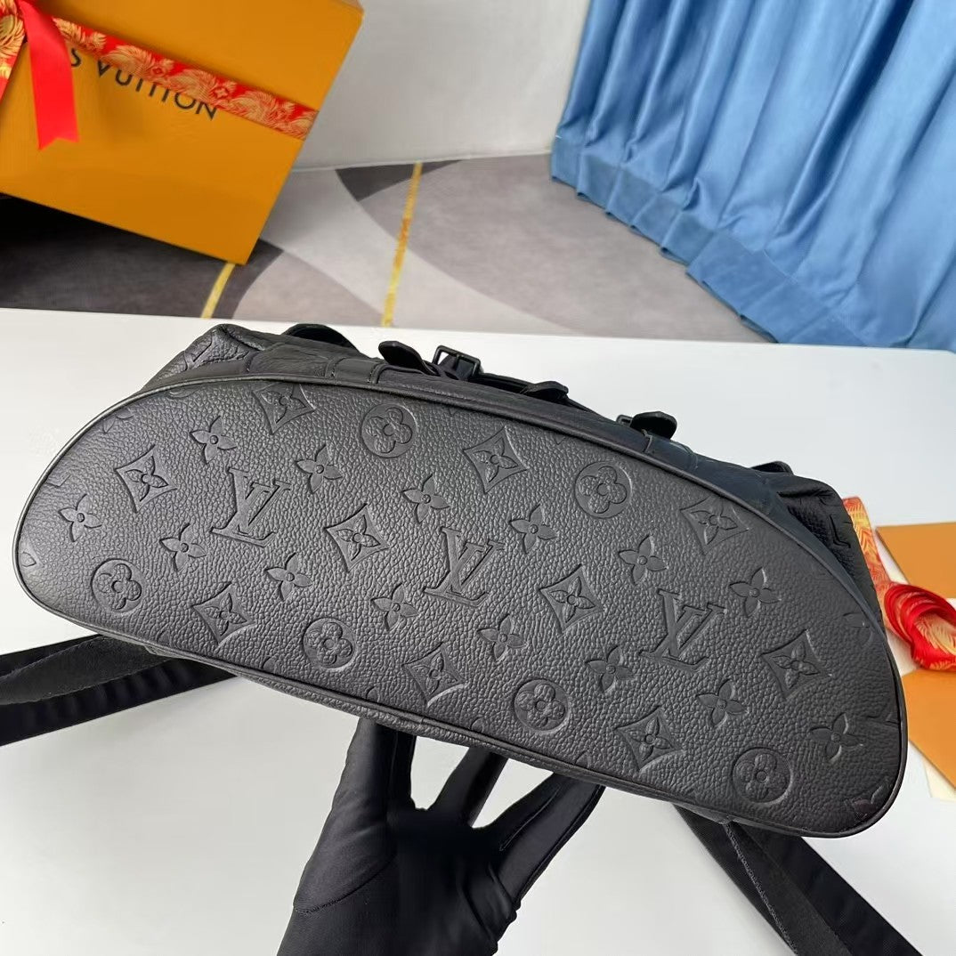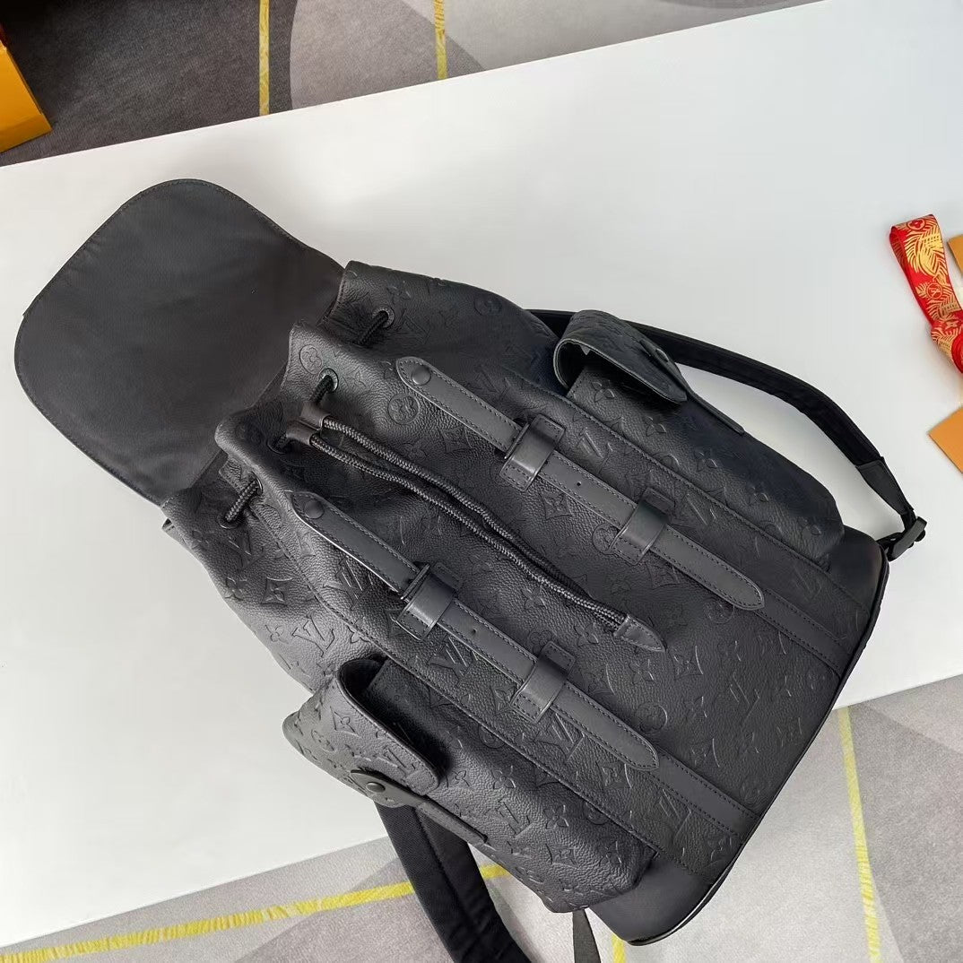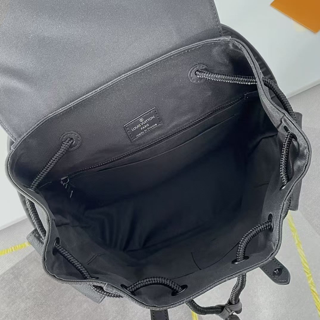 The Christopher medium-sized backpack is made of Taurillon leather embossed with the Monogram pattern. It has a moderate capacity, combined with outer side pockets and functional inner pockets. It is paired with leather shoulder straps and matte metal hardware. The drawstring and snap-button closure securely safeguards the items carried along. Dimensions: 38×44×21 cm.