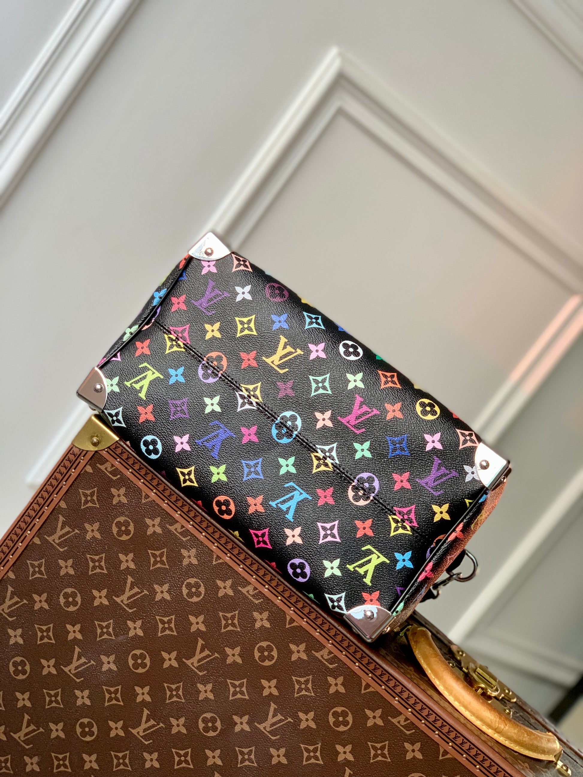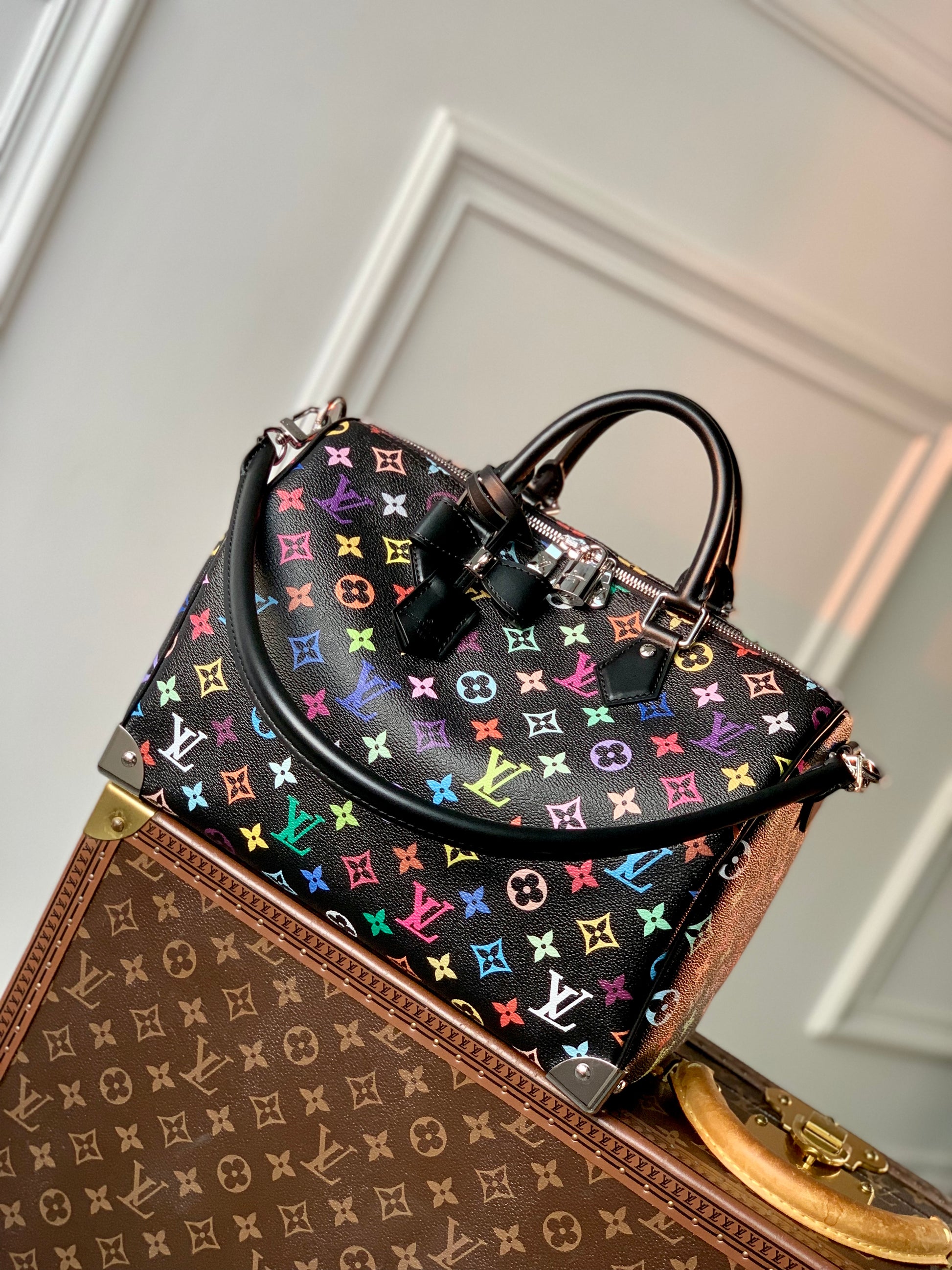 The Speedy Soft 30 makes an impact in supple coated canvas featuring an allover Monogram print in a vibrant rainbow palette as part of the re-edition of the Louis Vuitton x Murakami collection. The two Toron top handles and coordinating removable shoulder strap are crafted from tone-on-tone calf leather. Metallic corners recall detailing on the House’s heritage travel trunks, while a playful bow-shaped keybell fitted with a padlock adds a final signature touch.